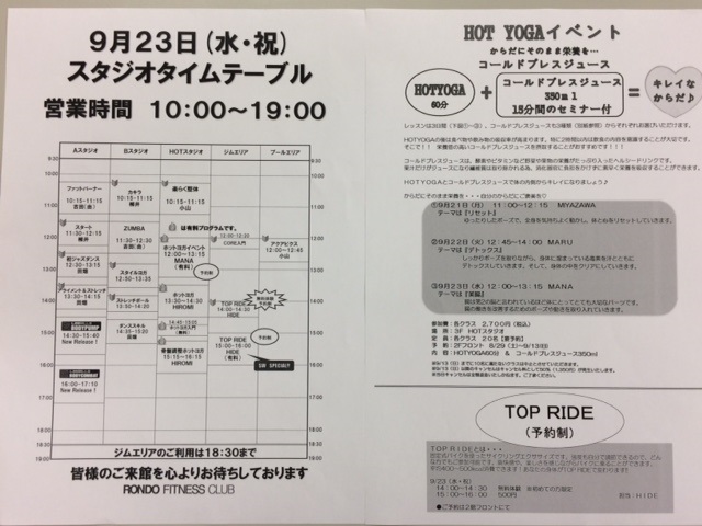 23日(水・祝)⇒①TOP RIDE(自転車プログラム) ②HOTヨガ×コールドジュースイベント