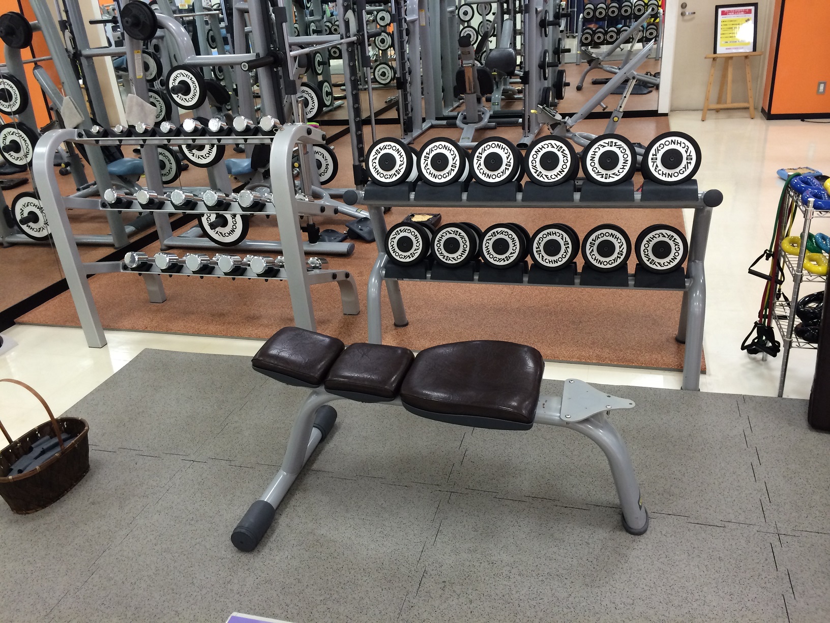 ⑫女性フリーウェイトエリアのベンチのシート張替中!シックで上質な感じですよ~(#^.^#)